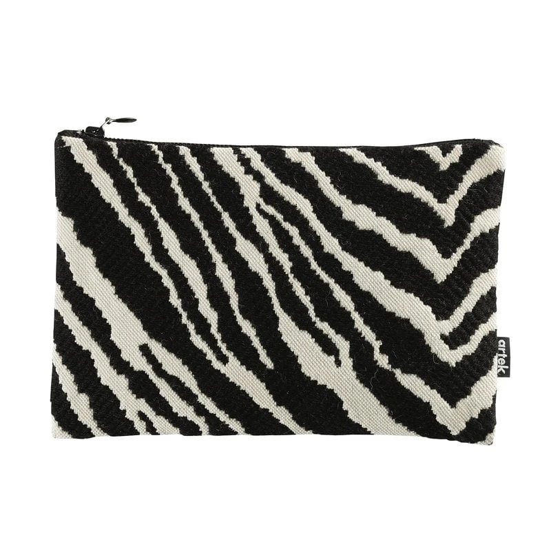Zebra-pussukka on valmistettu mustavalkoisesta klassikkokankaasta, jonka Aino Aalto löysi aikoinaan Euroopan-matkoillaan ja jota kudotaan nykyään Saksassa vain Artekin käyttöön. Pieni vetoketjullinen pussukka sopii monenlaisiin käyttötarkoituksiin kuten meikkipussiksi tai pikkutavaroiden säilyttämiseen.