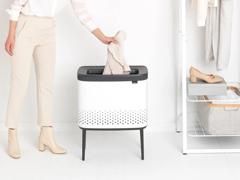 Suorakulmaisen muotonsa ansiosta Bo Laundry Bin asettuu tiiviisti esimerkiksi seinää vasten, ja sen pohjaan on asetettu lattiaa suojaavat liukuesteet, jotka pitävät pyykkikorin tukevasti paikoillaan. Säädettävät jalat antavat Bo Laundry Bin -pyykkikorille ilmavan luonteen ja käytännöllisen korkeuden. Pyykkikori on koristeltu rei’itetyllä kuvioinnilla, jolla on myös käytännön funktio: pienten aukkojen avulla ilma pääsee kiertämään umpinaisen korin sisällä.