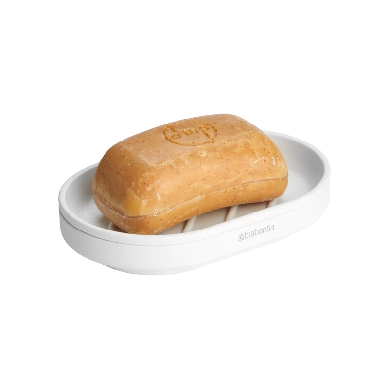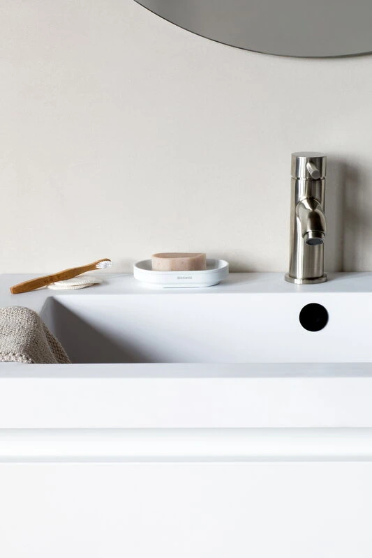 Brabantian MindSet-sarjan saippua-astia viimeistelee kylpyhuoneen ja WC-tilan ilmeen minimalistisella muotoilullaan. Metallista valmistetun saippuakupin muovinen sisäosa on helppo irrottaa puhdistusta ja ylimääräisen veden valuttamista varten ja sen uritettu pohja huolehtii, että palasaippua pääsee kuivumaan kunnolla pesukertojen välillä. Liukuestepohja pitää saippua-astian tiukasti paikoillaan kaikenlaisilla pinnoilla.