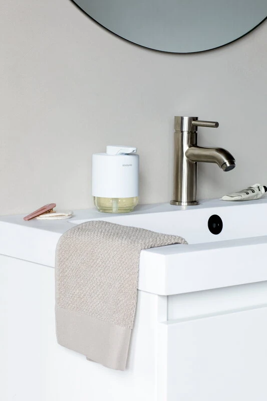Brabantian MindSet-sarjan saippua-annostelija on ehdottoman tyylikäs valinta niin kylpyhuoneeseen, vessaan kuin keittiötiloihinkin. Metallista valmistetussa saippuapumpussa on irrotettava lasinen säiliö, joka sekä näyttää kauniilta että kertoo, milloin annostelija on aika täyttää. Varta vasten valumista estämään suunniteltu muotoilu pitää saippuapullon puhtaana päivästä toiseen, ja irrotettavan saippuasäiliön ansiosta se on helppo puhdistaa huolellisesti – suuri täyttöaukko varmistaa käytön helppouden.