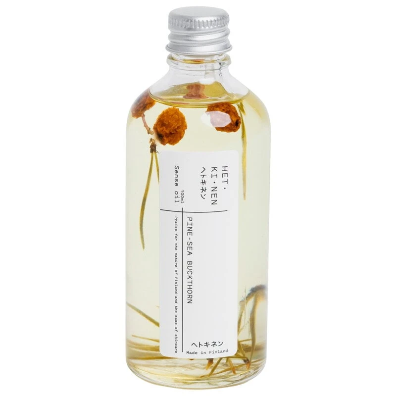Hetkinen-brändin Sense-vartaloöljy ravitsee ihoa kotimaisten luonnonkasvien voimin. Hellävaraiseen vartaloöljyn tehoaineina toimivat äärimmäisen ravinteikas tyrniöljy sekä männynneulasuute – antibakteerista ja antioksidanttipitoista tyrniöljyä käytetään monien iho-ongelmien, esimerkiksi tulehdusten, punoituksen, kuivan ihon ja aknen hoitoon, ja karotenoidi- ja C-vitamiinipitoisilla männynneulasilla on puolestaan ihoa rauhoittavia ja verenkiertoa tehostavia ominaisuuksia. Vartaloöljyn pohjana toimivat hyvin imeytyvät ja hoitavat manteli- ja rypälesiemenöljyt, ja nautinnollisen kokemuksen viimeistelevät männyn, palmarosan ja bergamotin eteeriset öljyt.