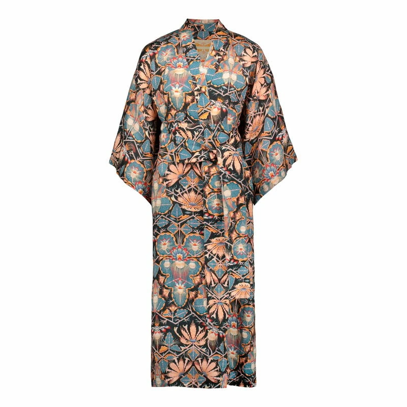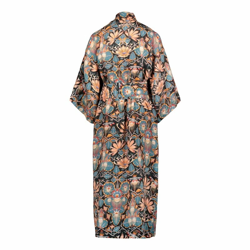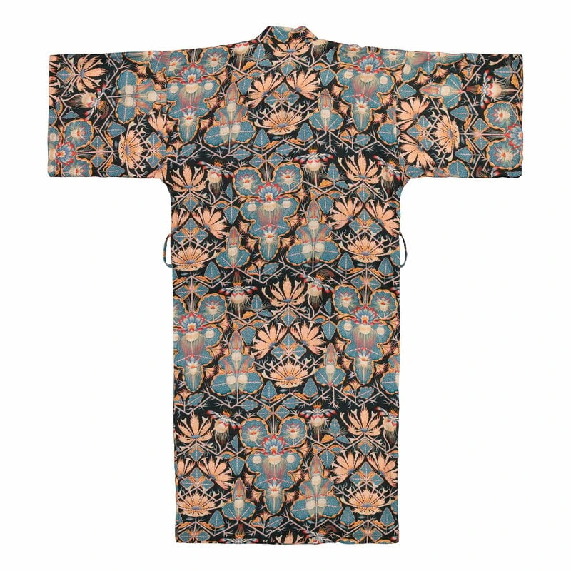 Klaus Haapaniemen Schizostylus Yukata -aamutakkia koristaa taianomainen kukkakuosi tummalla pohjalla. Japanilaistyylinen unisex-kimono on valmistettu Suomessa sataprosenttisesta pellavasta, ja siihen kuuluu pitkä, samaa kuosia oleva vyö.