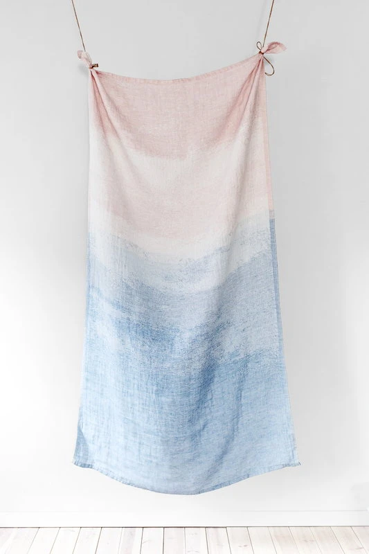 Lapuan Kankureiden Saari-jättipyyhettä värittää Aoi Yoshizawan suunnittelema tunnelmallinen, kaksisävyinen kuosi, joka vie ajatukset kauas ulapoille ja saaristomaisemiin. Saari-pyyhe on valmistettu sataprosenttisesta pellavasta ja kudottu Lapuan Kankureiden omalla kutomolla Pohjanmaalla.