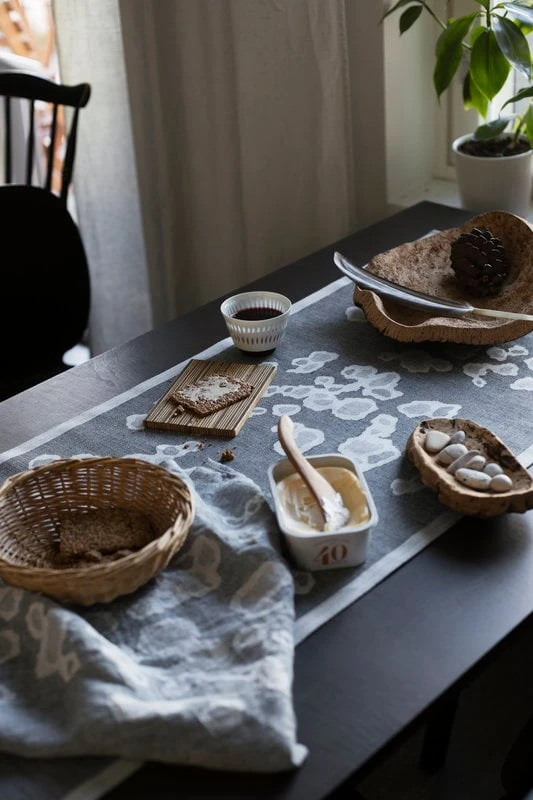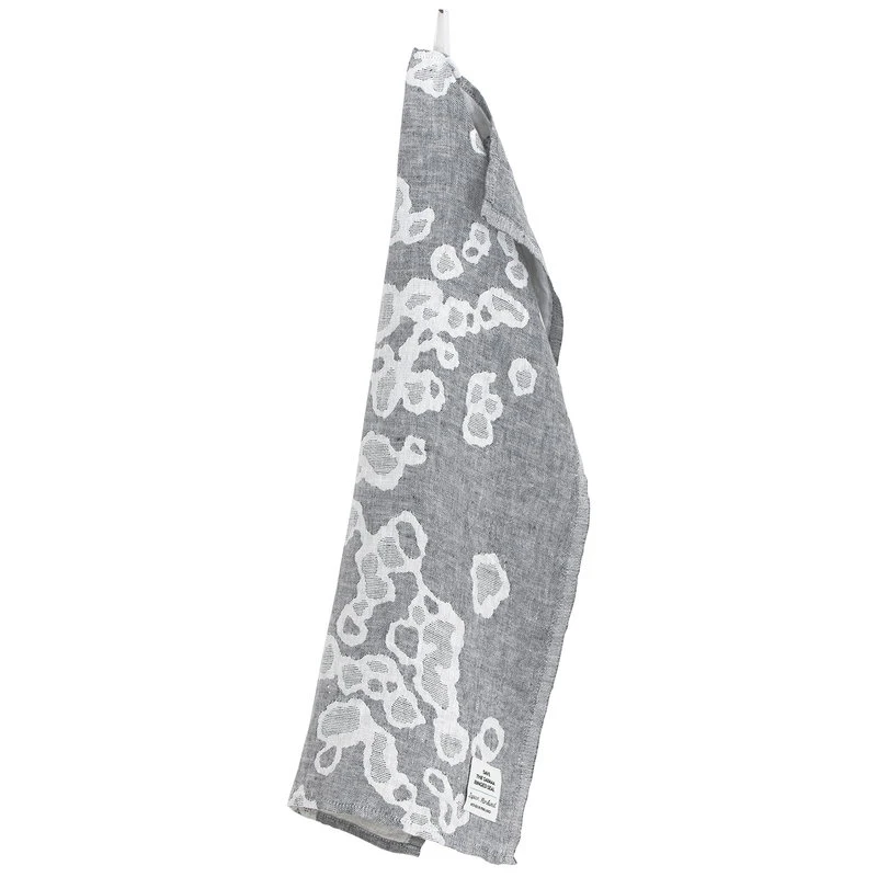 Lapuan Kankureiden Saimaannorppa-käsipyyhettä elävöittää Kaarina Tiaisen suunnittelema graafinen, valkoharmaa kuosi, joka jäljittelee norpan kylkien täpläkuviointia. Sataprosenttisesta pellavasta valmistettu pyyhe on kudottu Lapuan Kankureiden omalla kutomolla Pohjanmaalla.