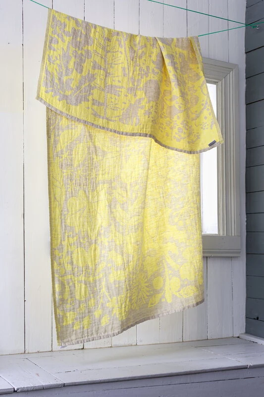 Lapuan Kankureiden Villiyrtit-kylpypyyhe on täydellinen kumppani kesäpäivään. Isoon pyyhkeeseen on ihana kietoutua uintireissun jälkeen, ja sen voi napata myös mukaan alustaksi rantahiekalle tai piknikviltiksi puistoon. Kylpypyyhe on valmistettu pellavasta, joka kuivuu nopeasti ja tuntuu miellyttävältä ihoa vasten. Tyylikästä pyyhettä koristaa Matti Pikkujämsän suunnittelema, runsaana rönsyävä Villiyrtit-kuosi, jonka aiheena ovat suomalaisen luonnon villit antimet. Kuvio toistuu toisella puolella vastakkaisella värityksellä. Pellavapyyhe on kudottu Lapuan Kankureiden omalla kutomolla Pohjanmaalla.