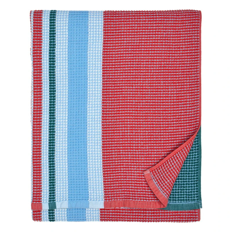 Kevyestä vohvelikankaasta valmistettu pyyhe on helppo pakata laukkuun rantapäiviä ja uimaretkiä varten, kuten myös yön yli kestäville reissuille. Pehmeä vohvelipyyhe tuo väriä ja tyyliä myös vaikkapa mökkisaunan pukuhuoneeseen.