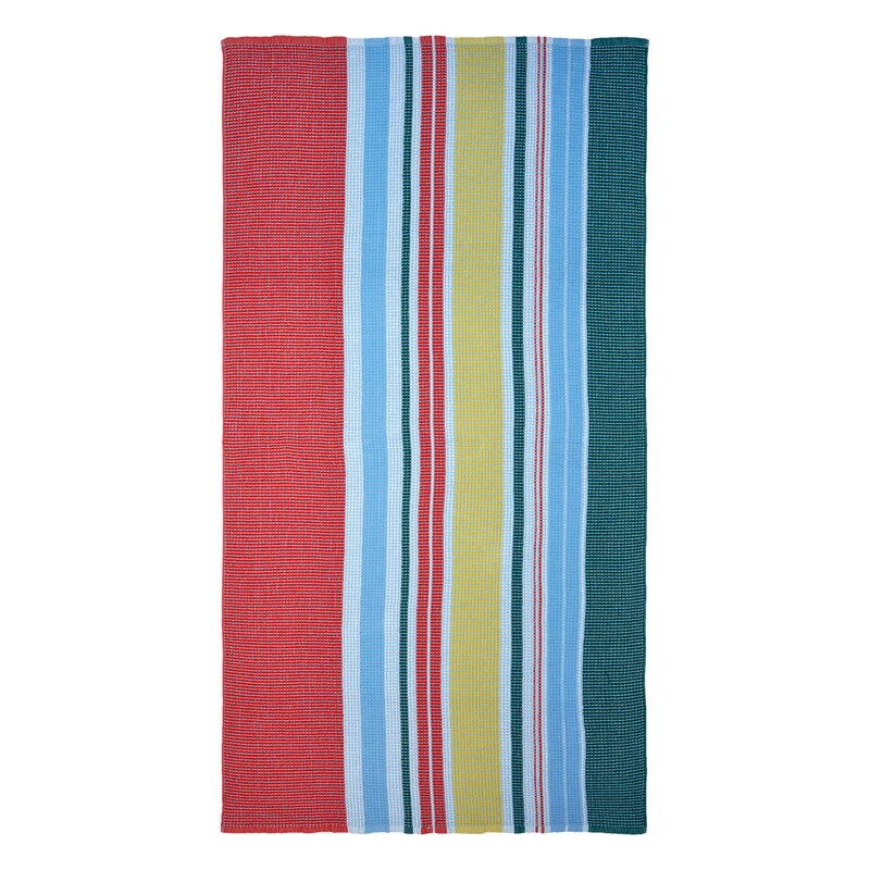 Marimekon rantapyyhettä koristaa Fujiwo Ishimoton suunnittelema, raidallinen Paraati-kuvio. Raidat ovat jo vuosikymmeniä olleet erottamaton osa Marimekon monipuolista kuviomaailmaa – monivärinen Paraati on Ishimoton raikas tulkinta niistä.