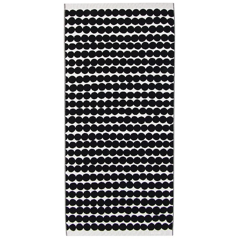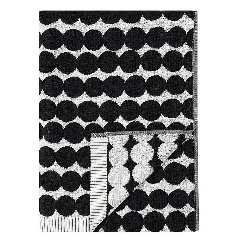 Marimekon Räsymatto-kylpypyyhettä somistaa Maija Louekarin rytmikäs mustavalkoinen kuosi, jonka inspiraationa on käytetty vanhojen suomalaisten räsymattojen tekstuuria ja tunnelmaa. Miellyttävän kokoinen pyyhe on mitoiltaan 70 x 150 cm ja se on valmistettu paksusta puuvillafroteesta. Viimeistele kylpyhuoneen tyyli Marimekon Räsymatto-minipyyhkeellä, -käsipyyhkeellä ja -vieraspyyhkeellä.
