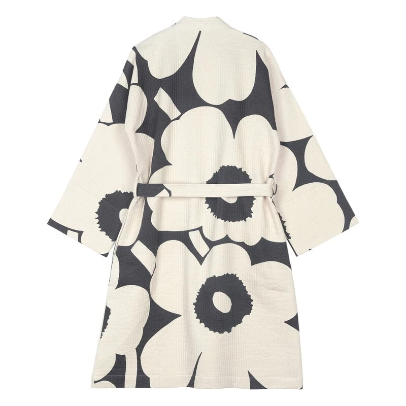 Marimekon Unikko-kylpytakkia somistaa Maija Isolan suunnittelema ikoninen kukkakuosi harmaan ja luonnonvalkoisen sävyissä. Kietaisumallinen kylpytakki on valmistettu puuvillavohvelikankaasta, ja siinä on irrotettava vyö sekä sivusaumataskut. Kylpytakin pitkät, väljät hihat on viimeistelty leveillä käänteillä.