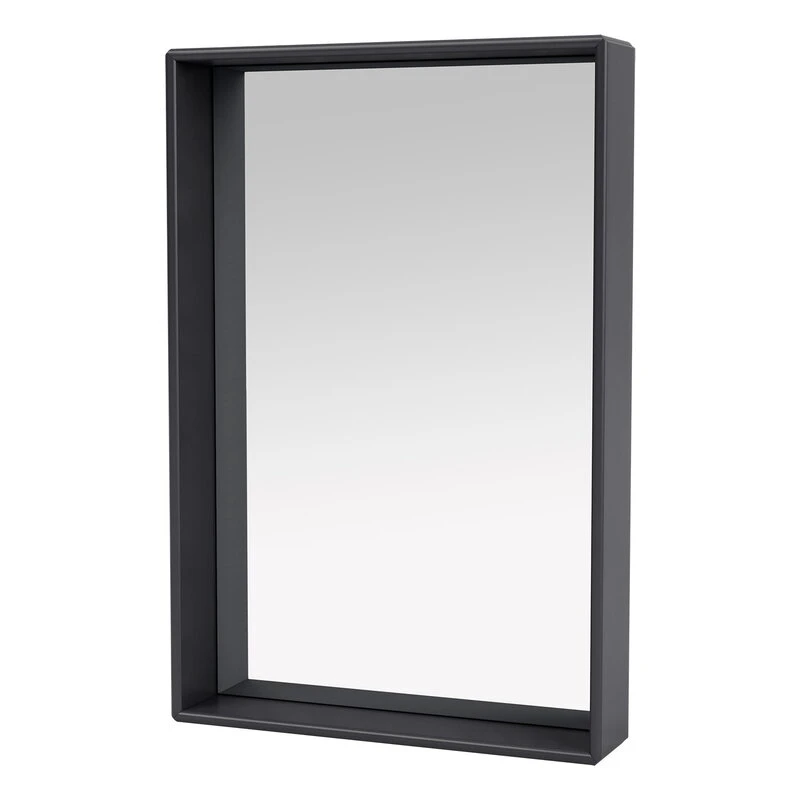 Montana Furnituren Shelfie-peili on selkeälinjainen, suorakulmion muotoinen kuvastin, jonka voi asentaa seinälle niin vaaka- kuin pystysuoraan. Vettähylkivästä MDF-levystä valmistettu peili sopii etenkin kylpyhuoneeseen, mutta myös eteisen, pukeutumistilan tai makuuhuoneen seinää piristämään. Peilissä on tumma kehys, joka tuo paitsi ryhtiä peilin ilmeeseen toimii samalla myös kätevänä säilytystasona – hyllylle on helppo laskea talteen niin hammasharjat, vanulaput kuin kosmetiikkapurkitkin.