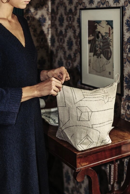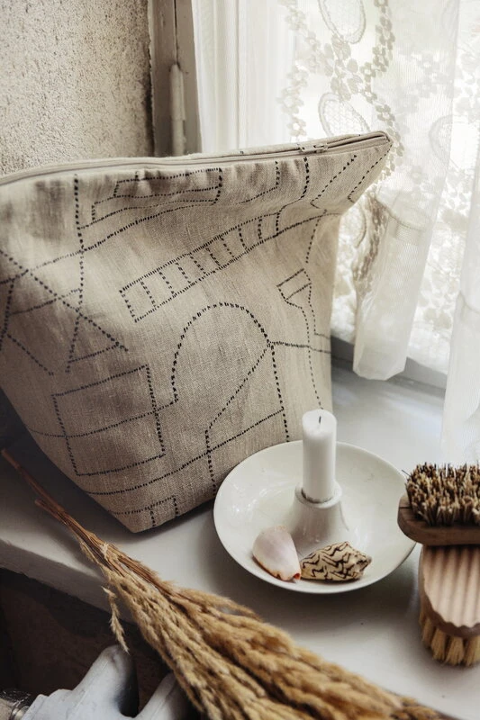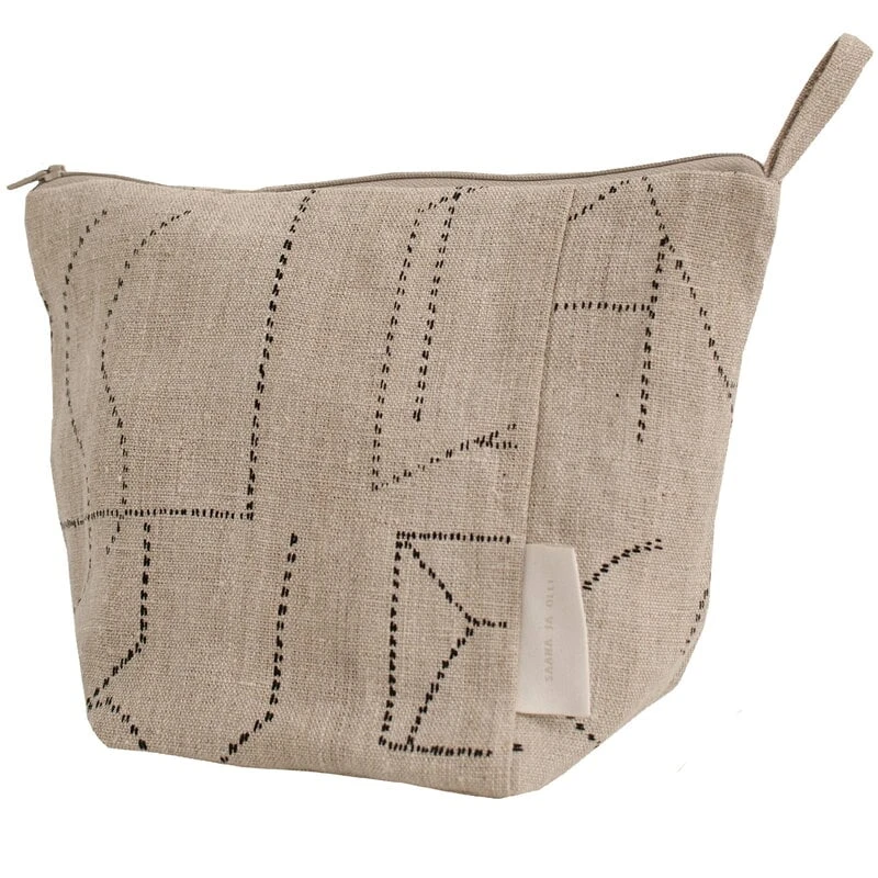 Saana ja Ollin Unien talo -kosmetiikkalaukun abstrakti kuosi on inspiroitunut rakennusperinteestä ja arkkitehtonisista unista. Kaksisävyistä Unien talo -kuosia rytmittävät hienovaraisesti luonnosteltujen linjojen luomat graafiset kuviot.