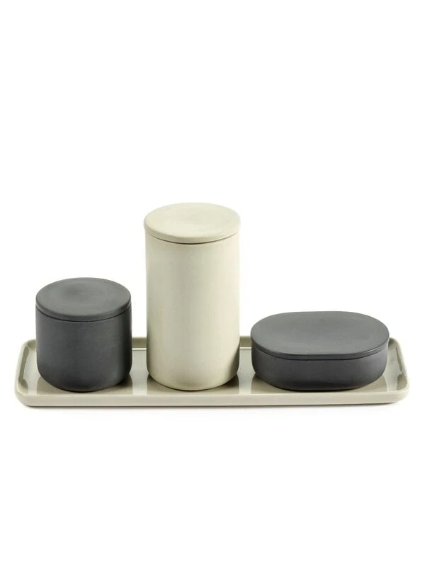Cose-säilytyspurkki kuuluu Bertrand Lejolyn suunnittelemaan samannimiseen kokoelmaan, jonka esineet sopivat niin kylpyhuoneen, keittiön kuin toimiston piensäilytykseen. Posliinista valmistettujen esineiden muotokieli on viehättävän pelkistetty, mutta ei suinkaan kliininen – pyöristetyt reunat ja lasittamaton ulkopinta tuovat kokoelman ilmeeseen pehmeyttä. Cose-sarja on samaan aikaan ajankohtainen ja ajaton, ja sen esineet onkin helppo kuvitella niin moderniin kuin perinteisempään sisustukseen.