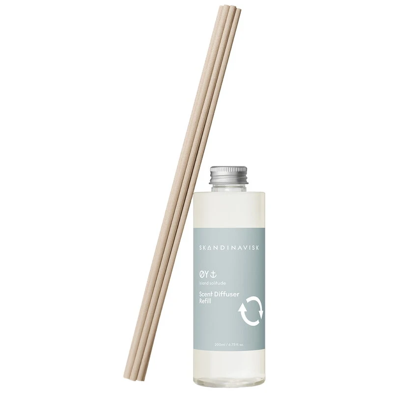 Tämä täyttöpakkaus on tarkoitettu Skandinaviskin huonetuoksuille. Edellisen tuoksun loputtua voit yksinkertaisesti täyttää lasipullon uudelleen, asettaa mukaan haluamasi määrän rottinkitikkuja ja antaa hienostuneiden pohjoismaisten tuoksujen täyttää jälleen huoneen. Kestävästi tuotetuista kasviöljyistä valmistettu, turvallinen ja alkoholiton tuoksuneste riittää noin kolmen kuukauden käyttöön.