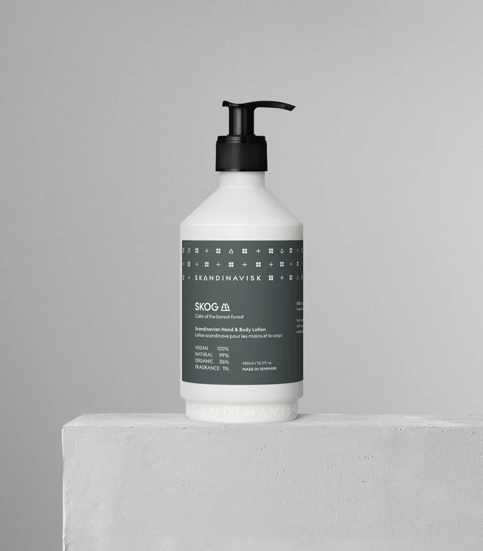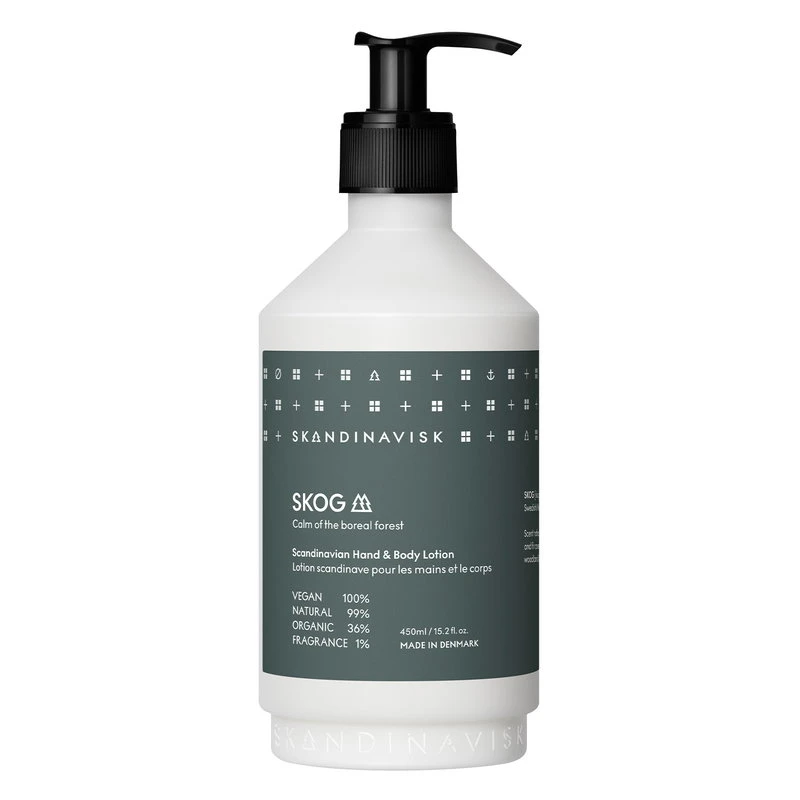 Skandinaviskin Skog-voiteessa voi aistia männyn, kuusen, kielon ja koivumahlan tuoksun – nimensä mukaisesti Skog kuvaa pohjoisten havumetsien ainutlaatuista tuoksumaailmaa. Kosteuttava käsi- ja vartalovoide on valmistettu Tanskassa luonnollisista raaka-aineista.