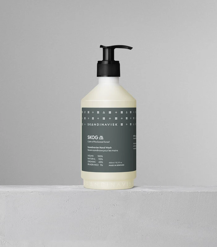 Skandinaviskin Skog-käsisaippuassa voi aistia männyn, kuusen, kielon ja koivumahlan tuoksun – nimensä mukaisesti Skog kuvaa pohjoisten havumetsien ainutlaatuista tuoksumaailmaa. Kevyesti vaahtoava käsisaippua on valmistettu Tanskassa luonnollisista raaka-aineista.